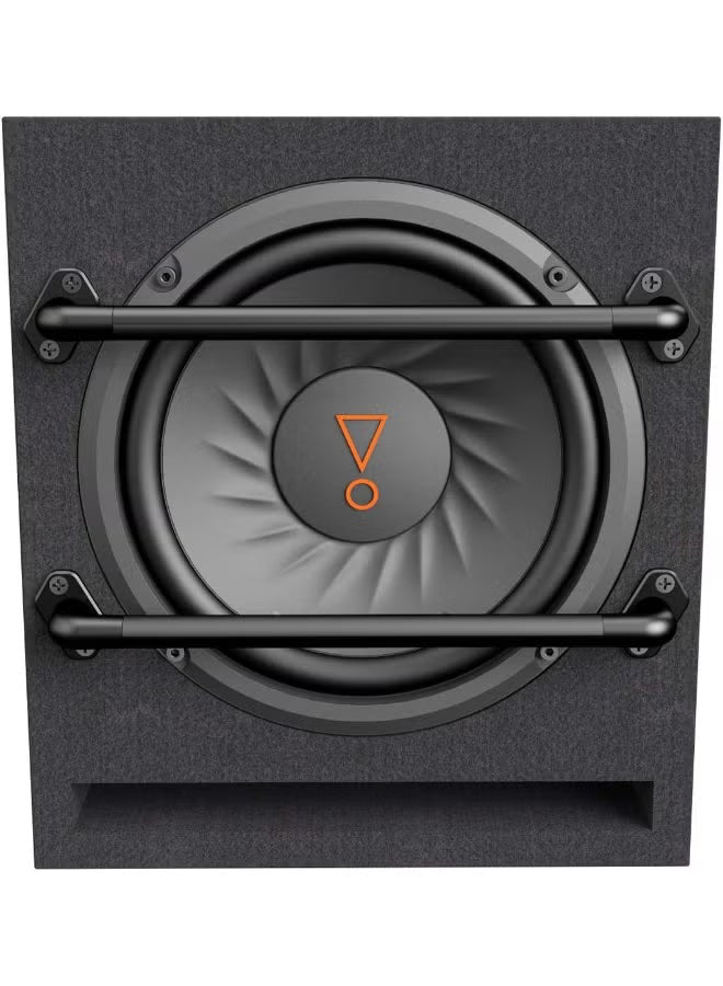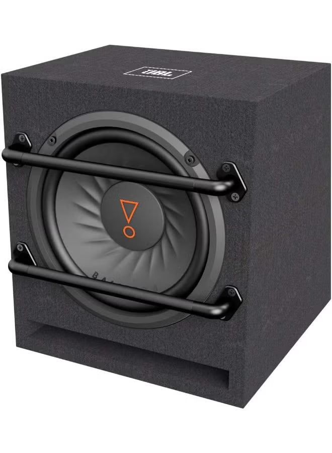 JBL's jaw-dropping BassPro 8 subwoofer measures less than a cubic foot and delivers an impactful performance. Inside the slot-port enclosure is a system tuned 100 watts RMS class D amplifier and 8" (200mm) subwoofer. The compact BassPro 8 will provide tight, deep bass in any car audio system. The subwoofer and amplifier have been engineered as a system to ensure great distortion-free bass even at high output levels. The rigid lightweight polypropylene woofer supplies the signature punch and clarity of JBL bass. When it's time to show and shine, the bass EQ control is good for a 9dB boost. With the legendary JBL® logo stamped front and center on the dust cap and the oversized protection bars, you have a bass system ready to do business.